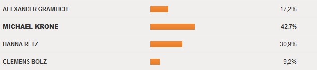 Wie Ihr der Grafik entnehmen könnt, hat fotocommunity-Kandidat Michael Krone auch in euren Augen das beste Bild geschossen. Eure 42,2% werden in 42,2 Punkte umgewandelt. Mit den Jurypunkten erhält Michael bei dieser Challenge somit 67,7 Punkte.