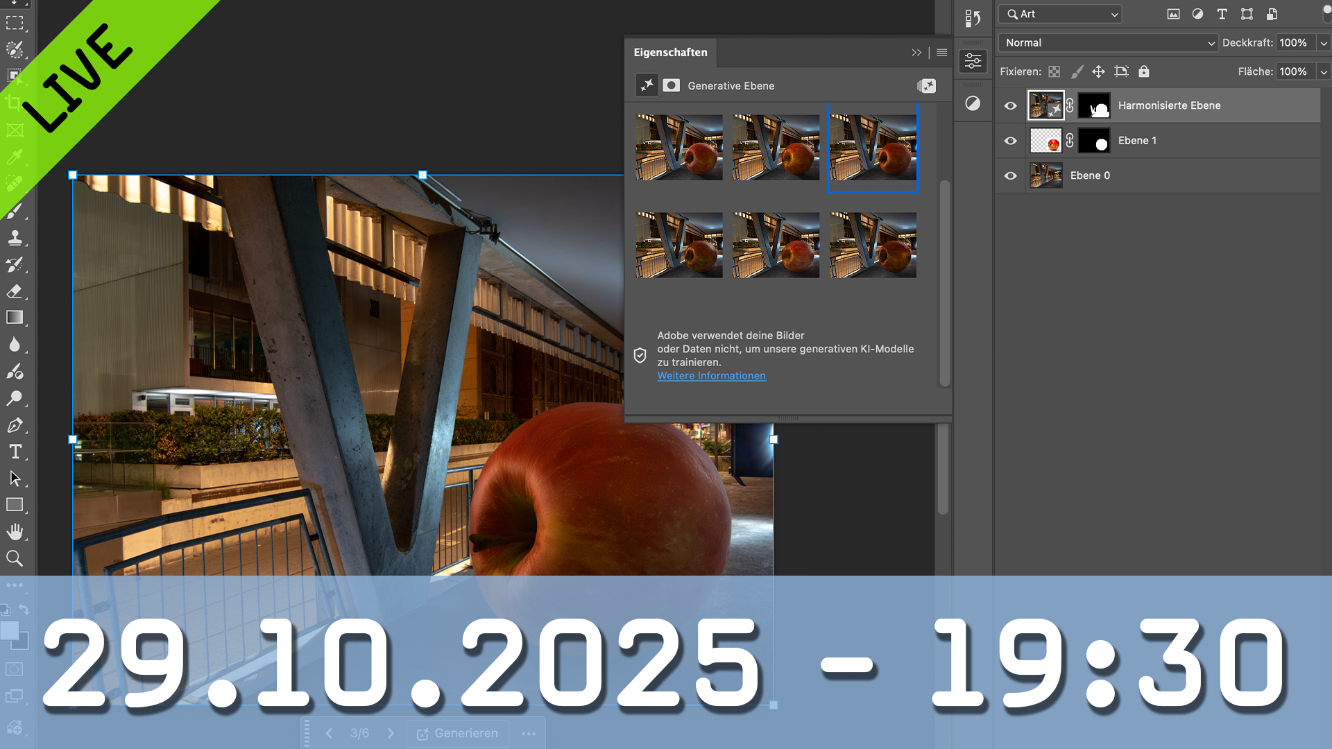 Photoshop 2026 bringt neue Funktionen, die nicht nur kleine Verbesserungen sind, sondern den kreativen Workflow grundlegend verändern können – vor allem im Zusammenspiel mit KI. In dieser Session am 29. Oktober um 19:30 Uhr zeigt dir Marwin, welche Neuerungen relevant sind, wie sie funktionieren und was sie dir in der Praxis bringen.