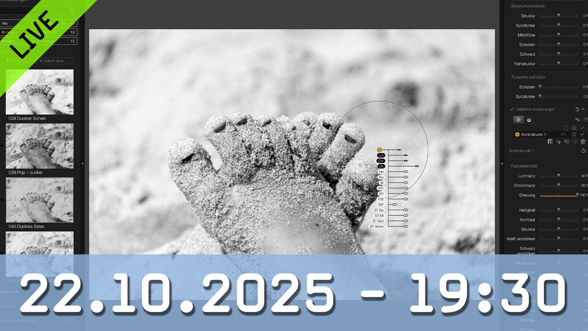 Am 15. Oktober um 19:30 Uhr findet eine weitere Session statt, in der eure Bilder besprochen werden. Vor einiger Zeit haben wir einen neuen Ansatz vorgestellt, wie man Fotos analysieren und konstruktiv bewerten kann – abseits der typischen Phrasen wie „der Horizont müsste begradigt werden“ oder „ich würde das enger schneiden“. Voraussetzung für die Teilnahme ist allerdings, dass du vorab ein eigenes Bild zur Besprechung per E-Mail an kerstin@fototv.de einreichst. Die Teilnehmerzahl ist auf 20 Teilnehmer begrenzt, um eine interaktive und persönliche Atmosphäre zu gewährleisten.