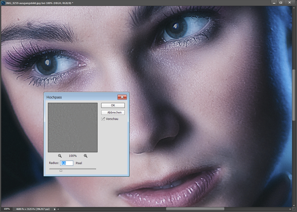 Wenn das Bild geladen ist, steht am Anfang besagte Frequenztrennung. Hier die Vorgehensweise: Man legt zwei Bildkopien an und nennt die untere LOW, die obere HIGH. Die untere wird weichgezeichnet mittels Gauß-Filter. Die Einstellung sollte so sein, dass keine störenden Strukturen mehr erkennbar sind: