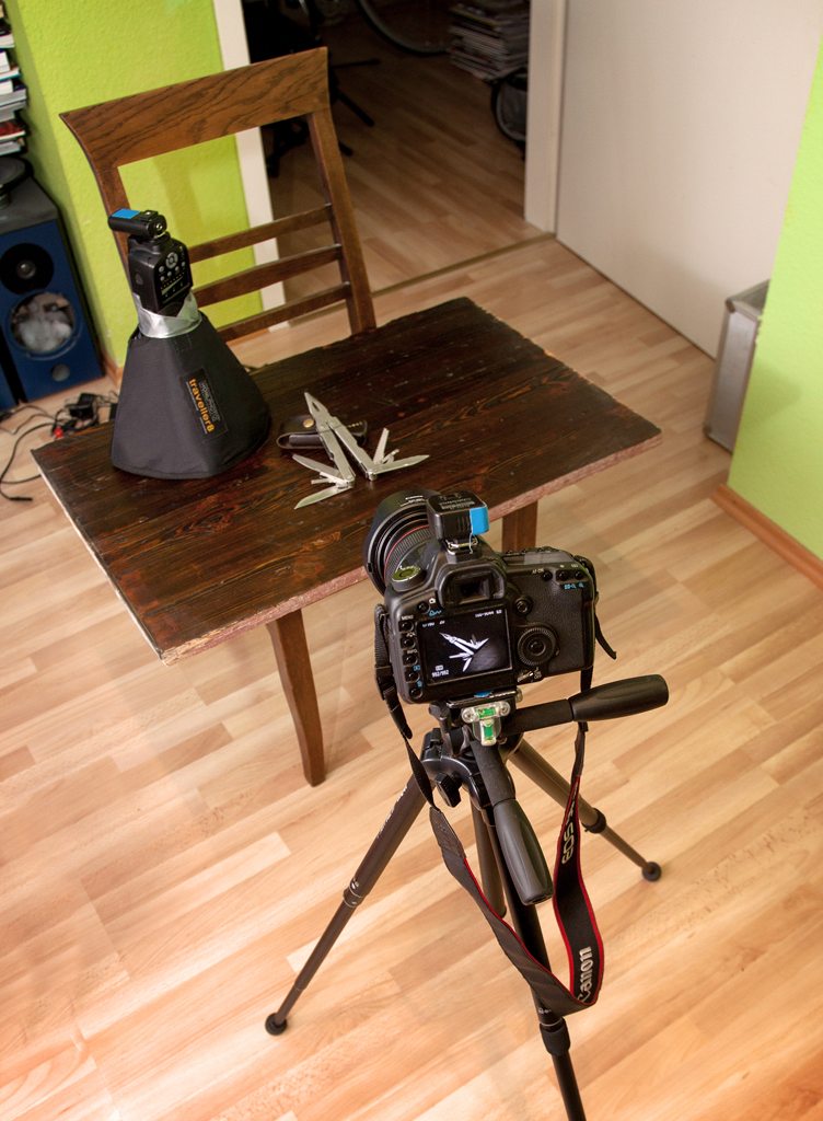 Ich habe dies einmal am Beispiel eines einfachen Objektfotos für Euch durchgespielt. Das verwendete Motiv, ein Leathermans Toolkit, hat viele Seiten und Facetten und kann mit nur einem Blitz kaum wirklich spannend ausgeleuchtet werden.