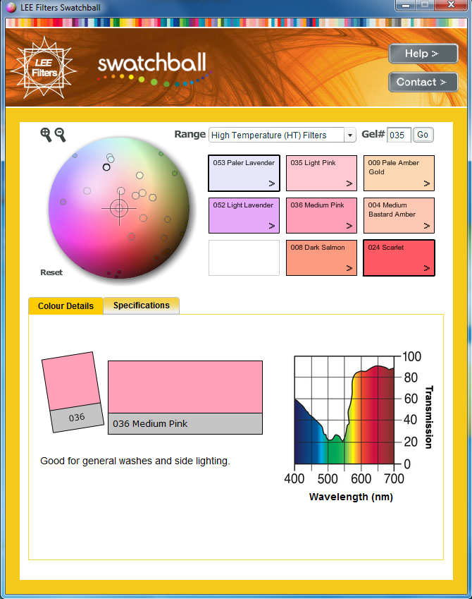 Screenshot aus dem kostenlosen Programm Swatchball der Firma LEE Filters mit einem passenden Filter als Grünsperre.